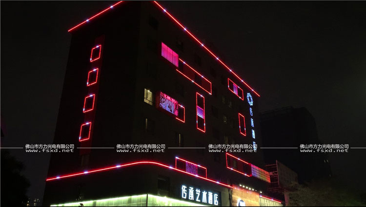 【应用领域】:灯光亮化【项目简介】:佛山市传承艺术酒店雄距于桂城街道聚元北路与佛平四路交汇处,与雄峰日产汽车专营店相邻,距怡丰城英皇影城只需步行5分钟即可到达,从佛山一环佛平路出口至平洲方向约800米,交通便利。 酒店按国家星级标准设计和建筑,把佛山特色与现代时尚元素完美结合,是本土首家以佛山文化为主题的精品型商务酒店。酒店拥有现代简约舒适客房、配有不同风格的棋牌室、中餐私房菜、餐厅粤式茶点、足球主题烧烤吧、私家停车场等等,是一间集商务及健康饮食、休闲于一体的精品商务型特色酒店,是您出行的理想之选。