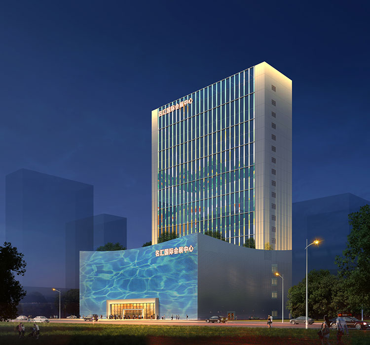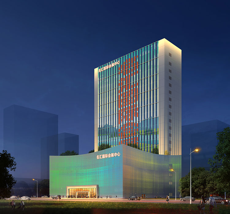 方向三:塔楼不变,裙楼 通过立杆装投影灯(裙楼 幕墙不作改变)。